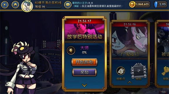 2、每日会轮换开放2个角色的专属活动关卡,这些关卡共设4个难度梯度:基础难度产出对应角色的铜技能道具,高级难度掉落银技能道具,专家难度可获取金技能道具,大师难度则会产出金技能道具与随机元素石碎片——这是玩家刷取角色技能的核心关卡。除角色专属活动外,该界面还设有“被诅咒的实验室”模式,此模式每周刷新一次,对新手而言挑战难度较高,建议积累一定练度后再尝试;通关可获得大量金币、技能点,以及铜、银、金钥匙各一把,其中的宝箱关卡还有小概率掉落钻石钥匙。