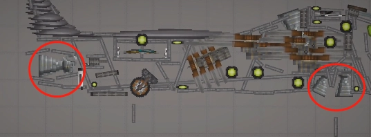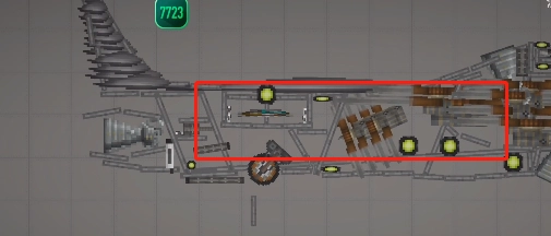 3、需要注意的是,这种不稳定的结构必须加装支柱——也就是机头中间的长铁块,将其设置为无重力且不碰撞的状态,然后连接到机头外壳就可以了。