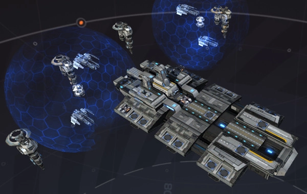游戏初期玩家的殖民舰等级较低,对应的对手实力自然也不会太强。此时可以把3个鱼雷炮按斜线方式安装在殖民舰上,如此一来,无论敌人从哪个方向发动攻击,都躲不开鱼雷炮的火力覆盖范围。接着将战舰部署在精炼站周边,充分发挥精炼站的维修作用。这种阵型在应对初级战舰的进攻时效果十分显著。