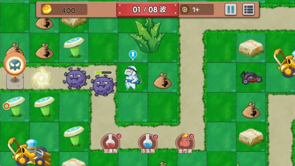 1、以抵御病毒为核心的生存塔防玩法,玩家可部署特色角色搭建防御阵线,借助位置规划来阻挡病毒的入侵。