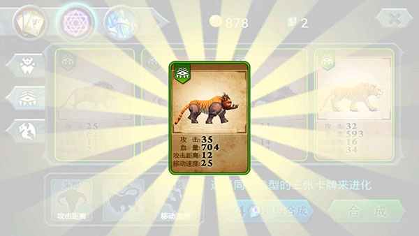 兽王进化可以提升整体实力。需要注意的是,进化需要消耗三张相同类型的卡牌,在前期阶段性价比偏低,因此建议先优先培养紫卡,之后再开展进化操作,绿色与蓝色卡牌不建议在早期进行使用。