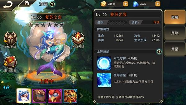 复苏之泉是一只金色品质的宠物,它在入场时能为己方全体提升防御力,效果持续两个回合;其回合技是群体治疗,特别适合没有奶妈的阵容,能有效增强队伍的续航能力。