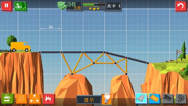 在这款模拟建造游戏里,你将化身为一名桥梁设计师,目标是用最经济的成本搭建出可供车辆安全通行的桥梁结构。面对多样的地貌环境,你需要构思并搭建适配的桥梁方案来达成关卡挑战。喜欢这类创意建造玩法的朋友,不妨来试试这款充满巧思的游戏吧!