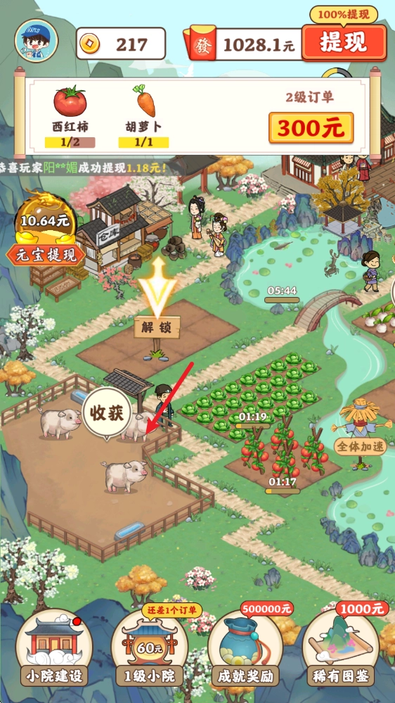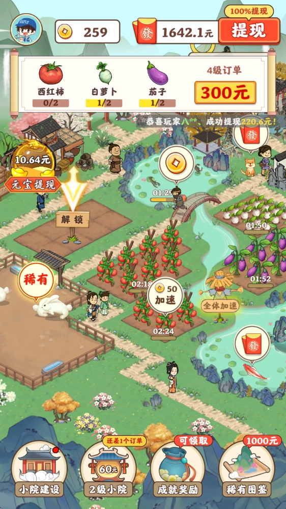 记得多花些心思打理你的小院,解锁并升级菜地、牧场、果园这些设施,这样能提升种植和养殖的效率,帮你完成更多订单。