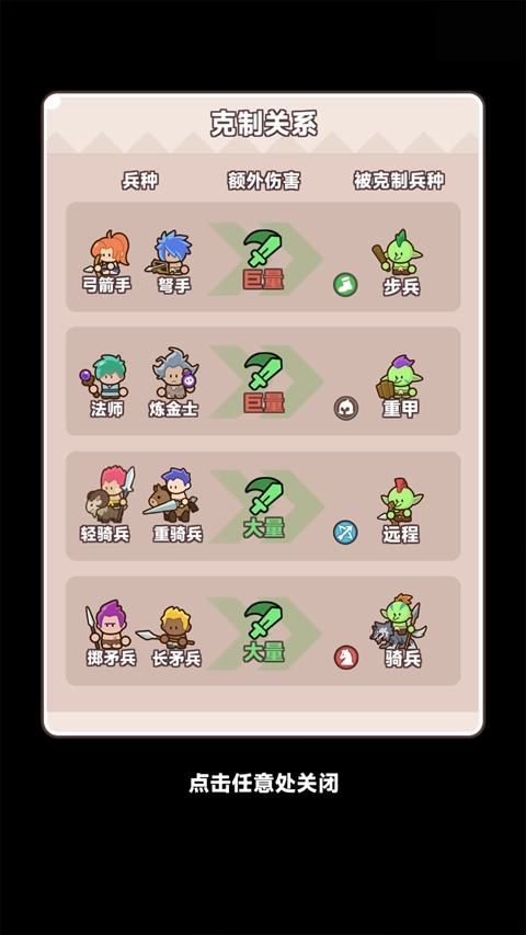 在冒险的进程里,玩家会解锁十多种别具特色的兵种,像顽强的步兵、擅长远程攻击的弓箭手、手持盾牌的盾牌兵以及拥有传奇色彩的魔法骑士等都涵盖其中。