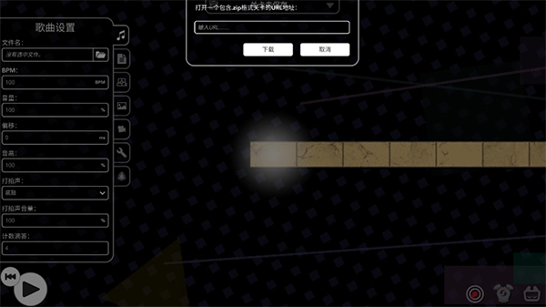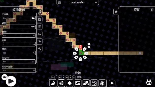 4、接下来就可以着手制作谱子了。首先要设定自制谱的bpm,通常歌曲的bpm数值处于100到150的范围,多尝试几次就能确定合适的数值。第二步是设置轨道,这也是整个制作过程中最关键的一步。一般情况下,我们会依据WASD键来规划轨道的走向,添加旋转符号能够调整节奏,若要删除方块,按下Delete键即可。