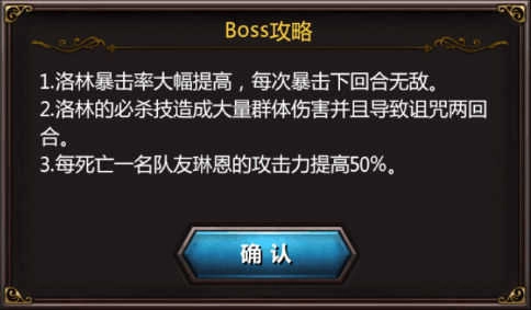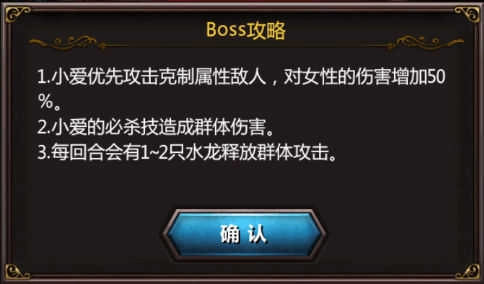 详细说明:门槛关。第一回合必须清掉小怪,不然可以重打。boss大招回合女性角色要防御。