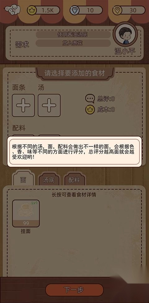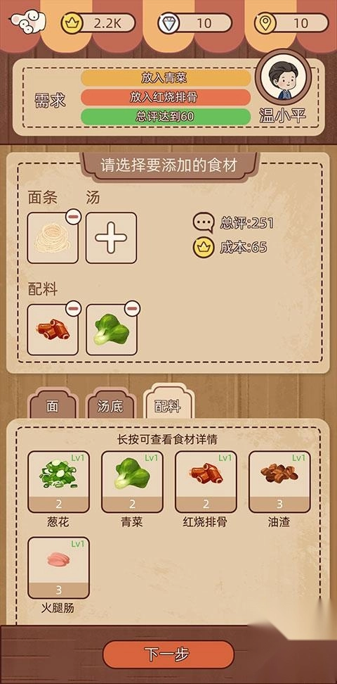 6、挑选配料时也得兼顾顾客的需求,唯有满足顾客的全部需求,才能顺利完成订单:从下方的面、汤底、配料选项里先选挂面,接着再按顺序选择汤底与配料。