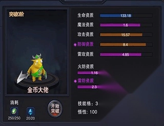 2、宠物的资质和成长情况,宠物生成时的成长系数与技能数量均为随机设定。成长系数的高低可依据蓝、紫、金、红的品质顺序来判断;技能数量由固定不变的主技能(主技能在宠物出生时就已确定,后续无法升级)加上1到3个被动技能组成。宠物在等级达到30级、50级、70级、90级时,各有一次使用对应等级突破石进行突破的机会。每次突破后,成长系数的整体区间会提升,但在当前品质阶段内的成长比例会发生变化——存在提升的可能,也可能降低(比如多次突破后,红色品质的成长比例或许会掉到紫色区间,蓝色品质也可能升到金色区间)。此外,悟性会有10至25的增长,技能格还有小概率额外增加一个!