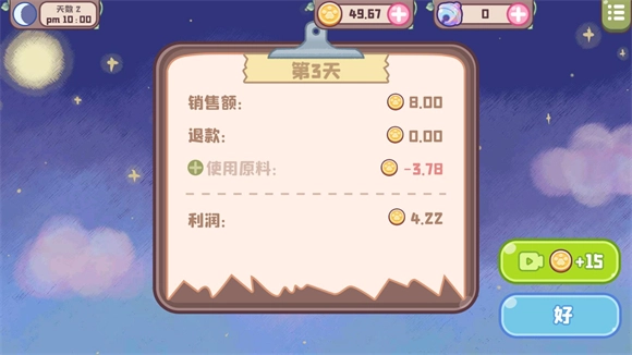 4、时间结束后,一天的经营便告一段落,这时玩家就能看到当日的收入情况。