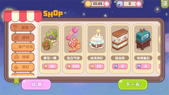 5、查看收入后,你可以选择升级店铺、解锁更多装饰,也可以继续进行下一天的经营。