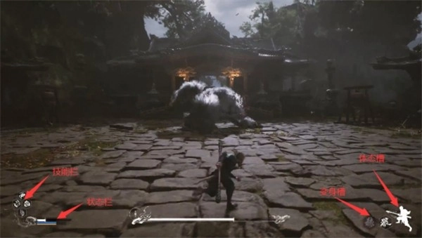 2、先看画面右下角,要是你足够细心,就能注意到战斗时悟空会依据战况持续改变体态,我们暂时把这个叫做体态槽吧。在整个战斗过程里,悟空一共用过三种作战体态,按照它们各自的特性,我将其命名为“强攻模式”“防御模式”“速攻模式”。