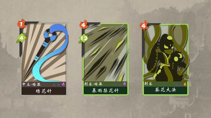 刺客—暴雨梨花针:消耗4点怒气,对敌方造成12点毒性伤害,同时获得两张绣花针。