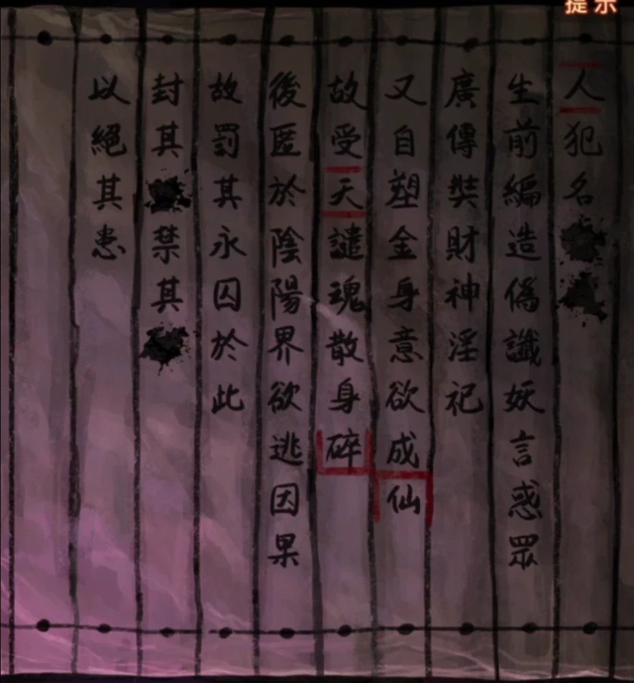 在最左侧隐蔽的地方还有一间牢房,查看纸人前面的竹简时要留意红线标记。上下都有红线标注的是“天”和“人”两个字,而用特殊形状红线分别圈起来的是“将碎”与“仙”。目前没有其他可用的线索,先把这些信息记录下来。