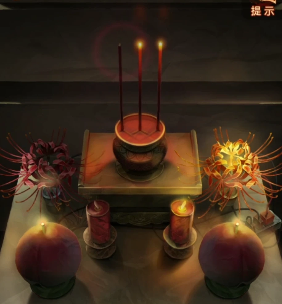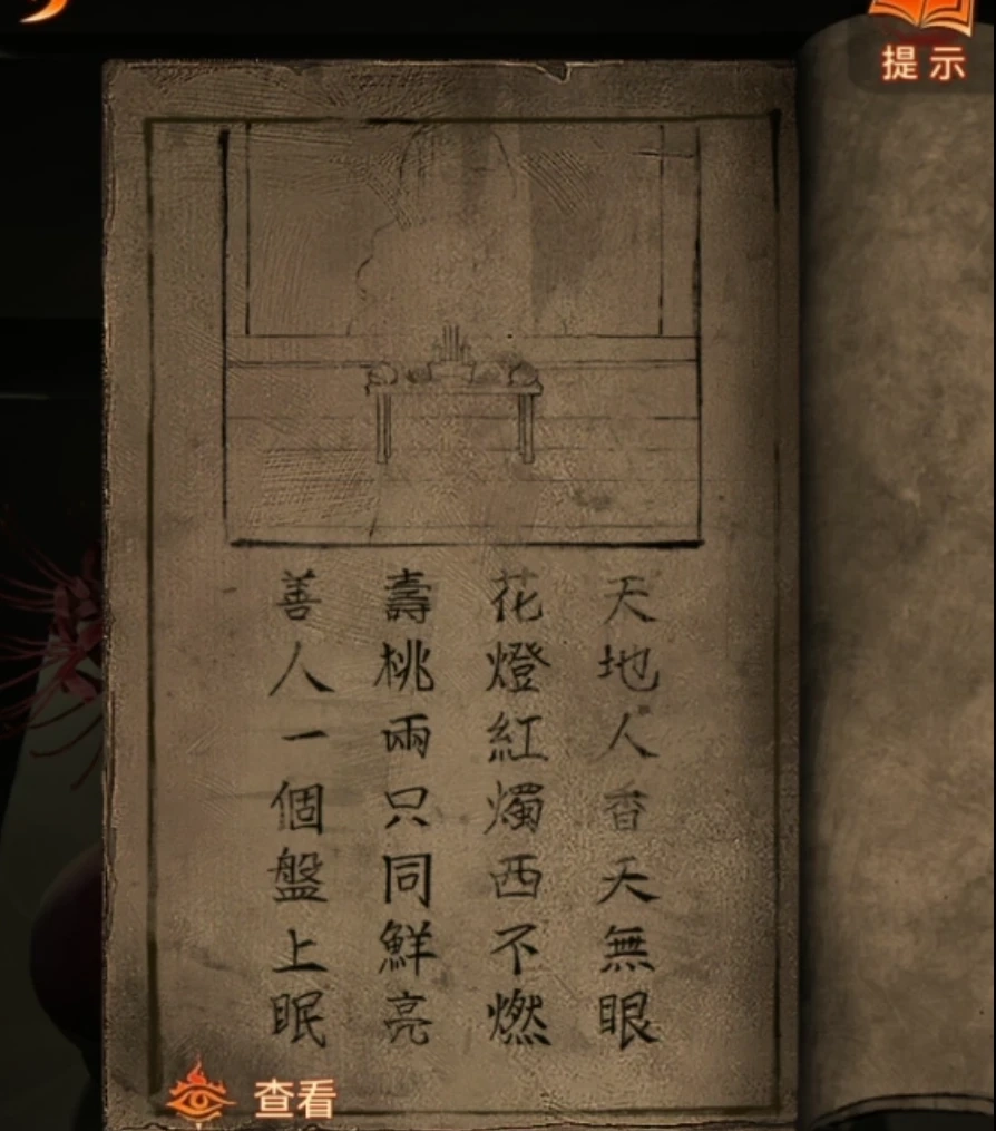 当暂时找不到更多线索时,翻看无字书能发现新的信息。联系供桌上的物品来看,“香”有着天地人的命名。由此推测,天无眼的意思是不必点亮天之香;而花灯和红烛只需要点亮西侧,按照上北下南左西右东的规则,也就是只点亮右侧。对供桌进行调整后,寿桃出现了裂开的情况,从中得到了僧人雕像与齿轮。依据“善人盘上眠”的提示,把雕像放在天平左侧代表善的位置。之后,后方的地狱之门就变成了阴阳牢。