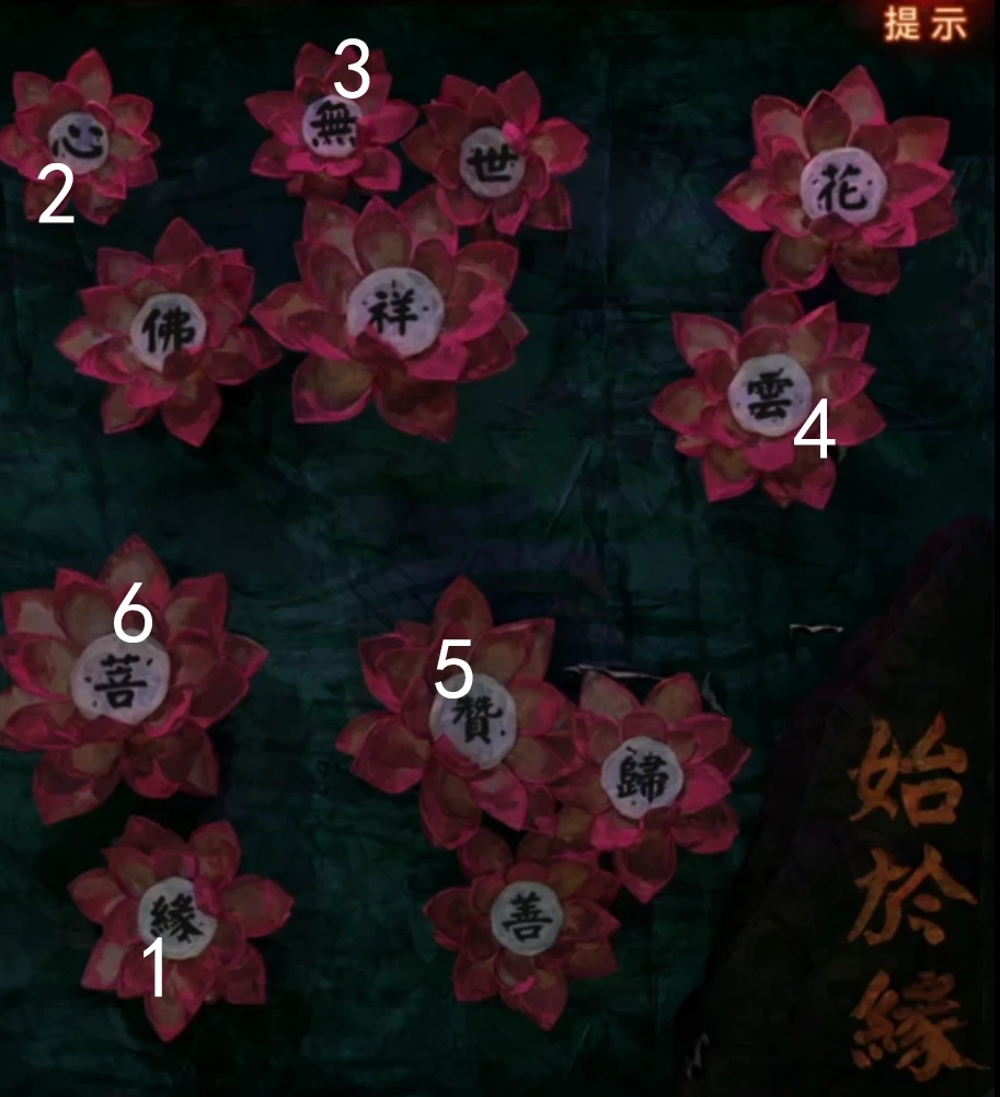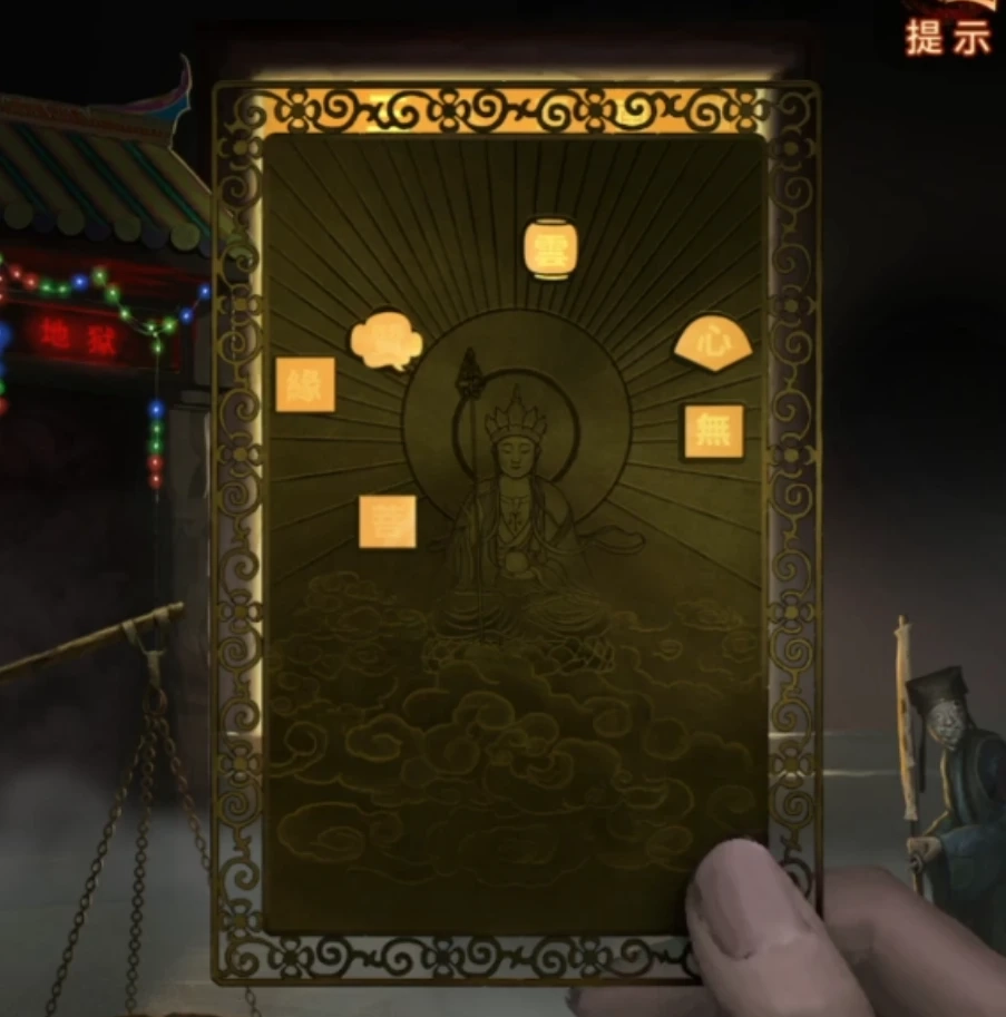 把带孔卡片拿出来凑近菩萨背景墙,透过小孔能看到特定的文字:长方形对应的是“缘”,云朵对应的是“赞”,正方形对应的是“菩”,灯笼对应的是“云”,扇子对应的是“心”。还有一个正方形代表“无”。因为图形比较相似,这说不定不是和形状相关的线索。把亮起的顺序记下来:缘、心、无、云、赞、菩。这些文字会循环着亮,所以第一个亮的字不一定是“缘”。