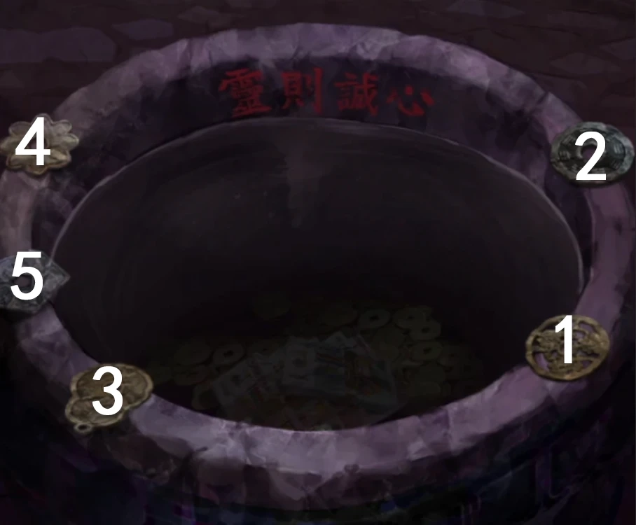 剧情推进后,先到水缸旁边捡起一枚花钱,再从右侧倒挂的尸体手里拿到带孔卡片。左边有一串图案得记下来,顺序是窗花、圆形、葫芦、小花和五边形。查看左侧柜子时,能在唱片机上找到五枚纸钱。把这些纸钱扔到中间的水缸里,然后按照右侧门上的提示依次点击。等所有纸钱都用完后稍微退一步,就能看到大门打开了,接着进入菩萨房间。