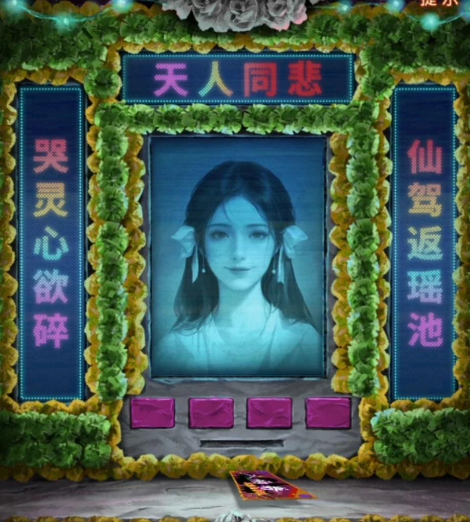 在木偶戏演出过程中拿到哀杖与毛笔,之后剧情提示需要算盘。接着前往阴阳牢,用毛笔完成登记,从狱卒那里拿到女主的照片。回到剧场后,点击舞台赛博灵台下方的花坛,移动花坛后会出现四个按钮和一条缝隙。把女主照片放进缝隙里,再按顺序调整按钮:第一个按钮调成主角像,第二个和第四个按钮分别对应左右对联,根据竹简的线索选择“哭灵心欲碎”和“仙驾返瑶池”,第三个按钮调成横批“天人同悲”。等所有按钮调整好,就能获得入场券了。