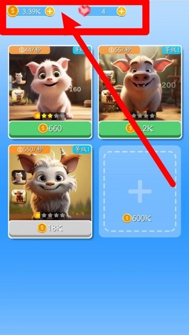 3.收益积累:通过合成解锁高级动物不断提升金币产出,同时还可积攒爱心资源强化成长。