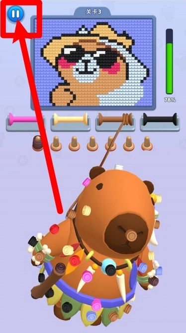 2.左上角设置有暂停按钮,根据不同毛线颜色提示依次填充色块,逐渐补全细节,完成戴墨镜熊角色的像素图像。