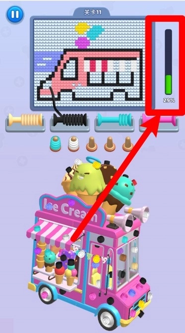 3.右侧进度条实时显示完成度,需使用黑色和蓝色毛线依次填充区域,慢慢绘制出冰淇淋车的精美像素画造型。