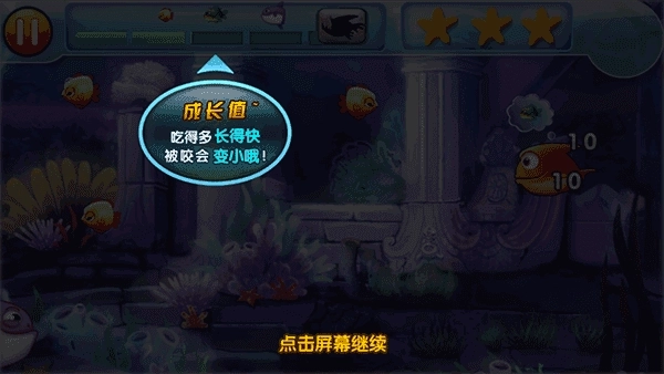 左右滑动屏幕调整游动方向,当靠近小型生物时会自动触发吞噬判定,能否成功将其吞入腹中,取决于触发的时机和角度。