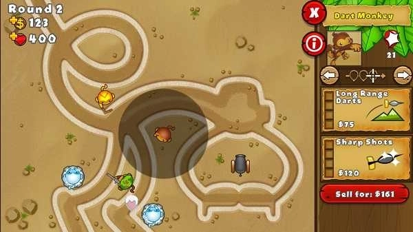 分别建造飞镖猴、图钉塔(放置在弯道处)、回旋镖猴以及忍者猴(具备攻击迷彩气球的能力),这些防御单位价格经济实惠,相互配合也十分默契。
