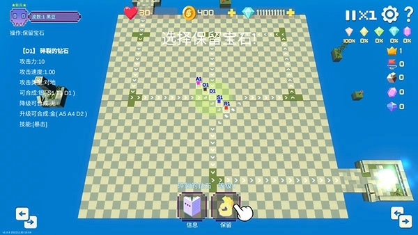 1、每一波开始之前,会先放置5颗随机宝石;放置完成后,需要从这些宝石里挑选一颗保留下来,剩下的宝石都会变成石头,这些石头可以用来搭建迷宫。