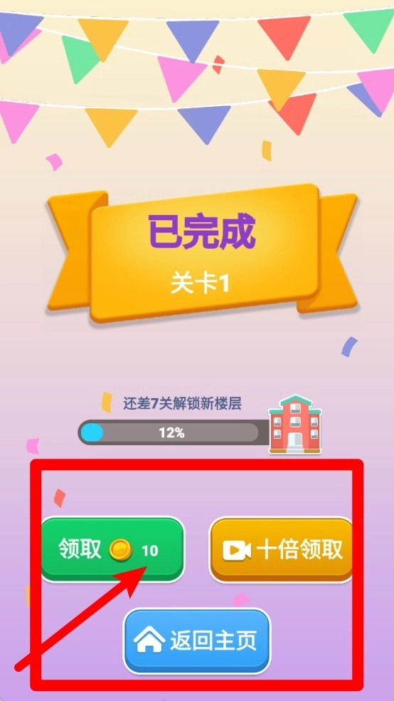 3.完成关卡后,系统会告知玩家的通关状况,玩家可选择直接领取金币,也能通过观看视频来获得十倍金币奖励,以此提升闯关的奖励收益。