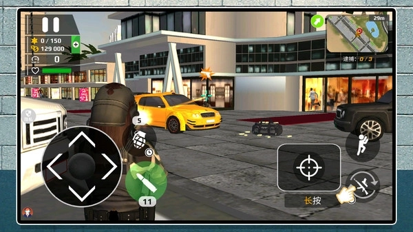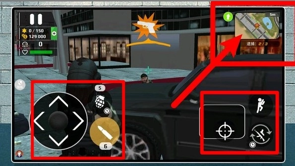 2.城市战斗界面:右上角小地图显示目标与路线,左侧虚拟摇杆移动,右侧开火与瞄准,利用车辆与掩体切换位置,稳步推进清剿任务。