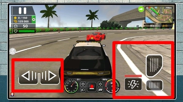 1.赛道驾驶界面:左侧为方向控制键,右侧为加速、刹车与氮气冲刺按钮,合理配合漂移与弯道减速,快速甩开对手完成追击。