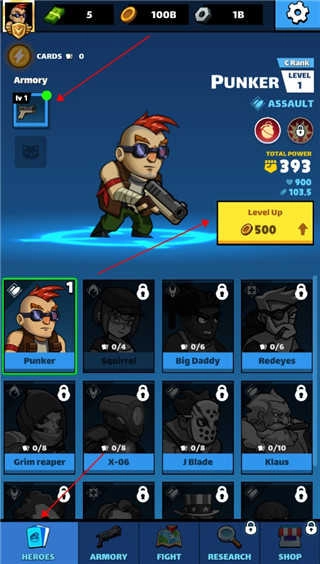 6、回到界面后我们进入这个页面,在这里可以对角色进行升级,也能点击左上角的武器选择来更换武器。