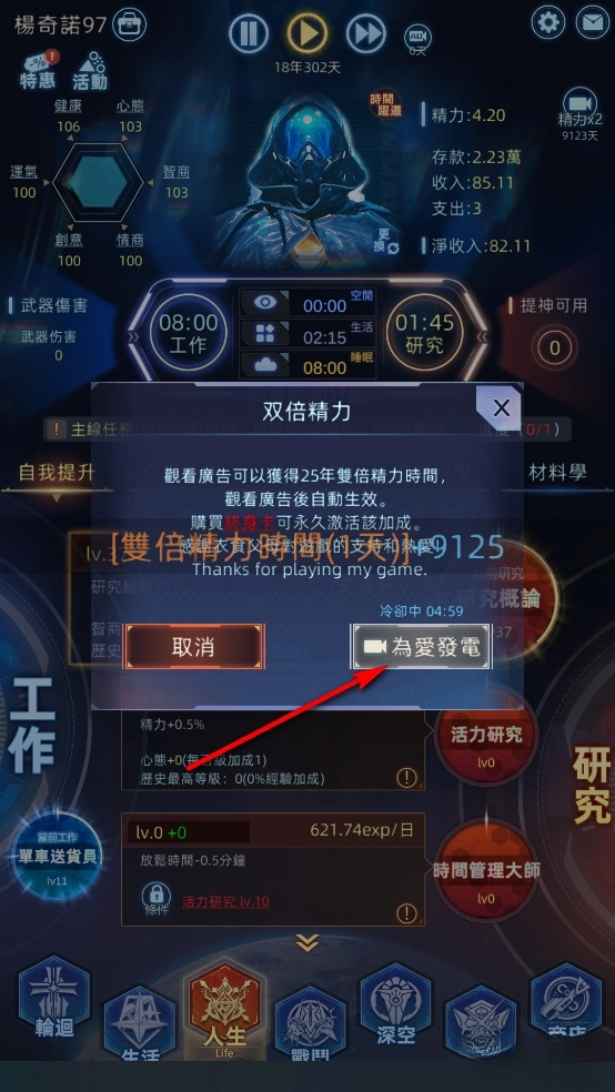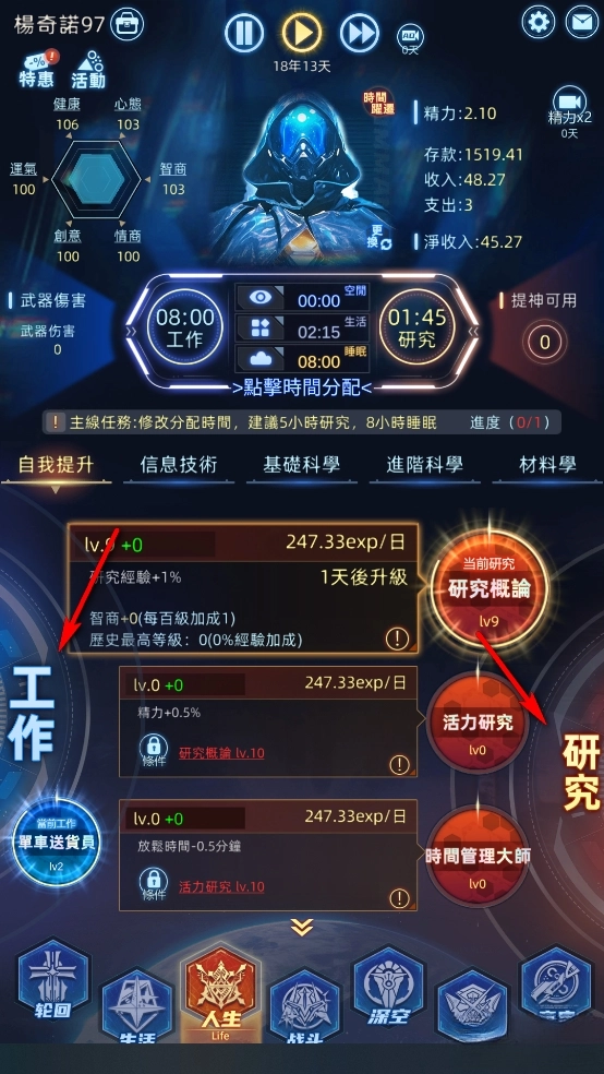 随后进入游戏界面,能够进行【工作】与【研究】。
