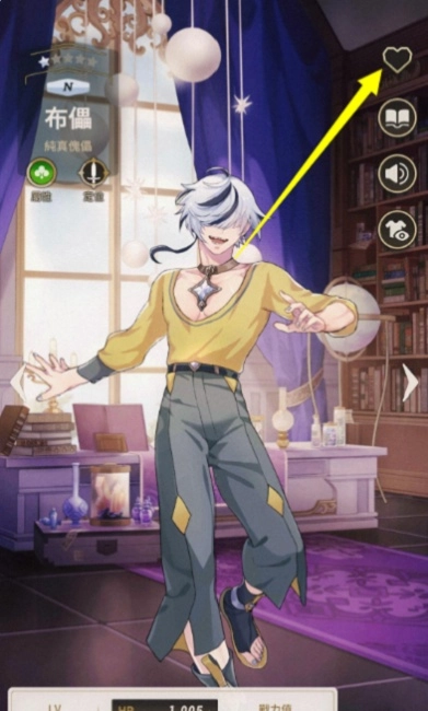 在角色详细信息界面的右上角,有一个爱心图标,玩家只需直接点击它就行。