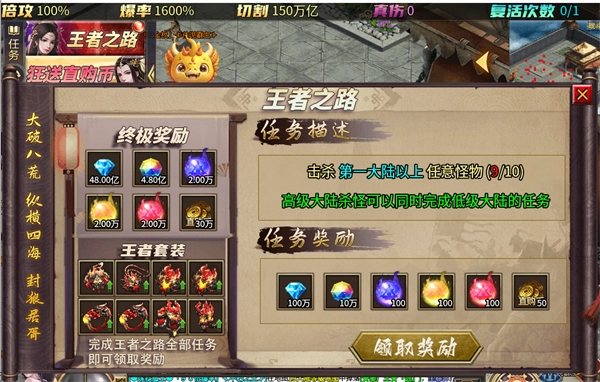 只要完成王者之路的全部任务,就能领取奖励。在前期,我们所需提升的项目,都有对应的 NPC 分布在每个大陆的安全区周边。把领到的材料全部用于提升,直至升满,便可进入下一大陆。要是材料不够该如何解决呢?直接前往地图打怪就行!所有用于提升的材料,都能通过打怪获取,爆率非常高!