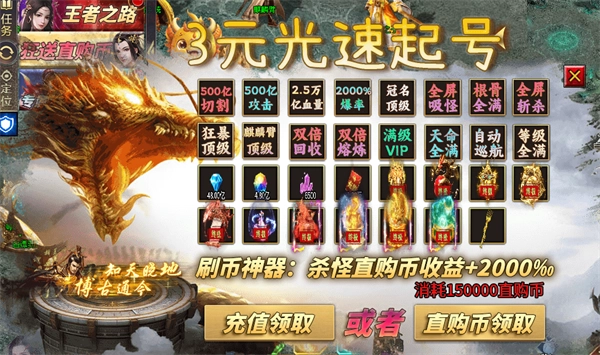 1、充值比例1:1,上线即领万亿切割、范围嘲讽技能,角色还能直升9999级!