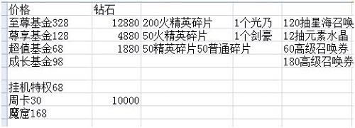 表格里的项目都要买,另外再充18元的日充;其他的充值项目就等有活动的时候再充,比如装备锻造活动、符文充能活动这些。