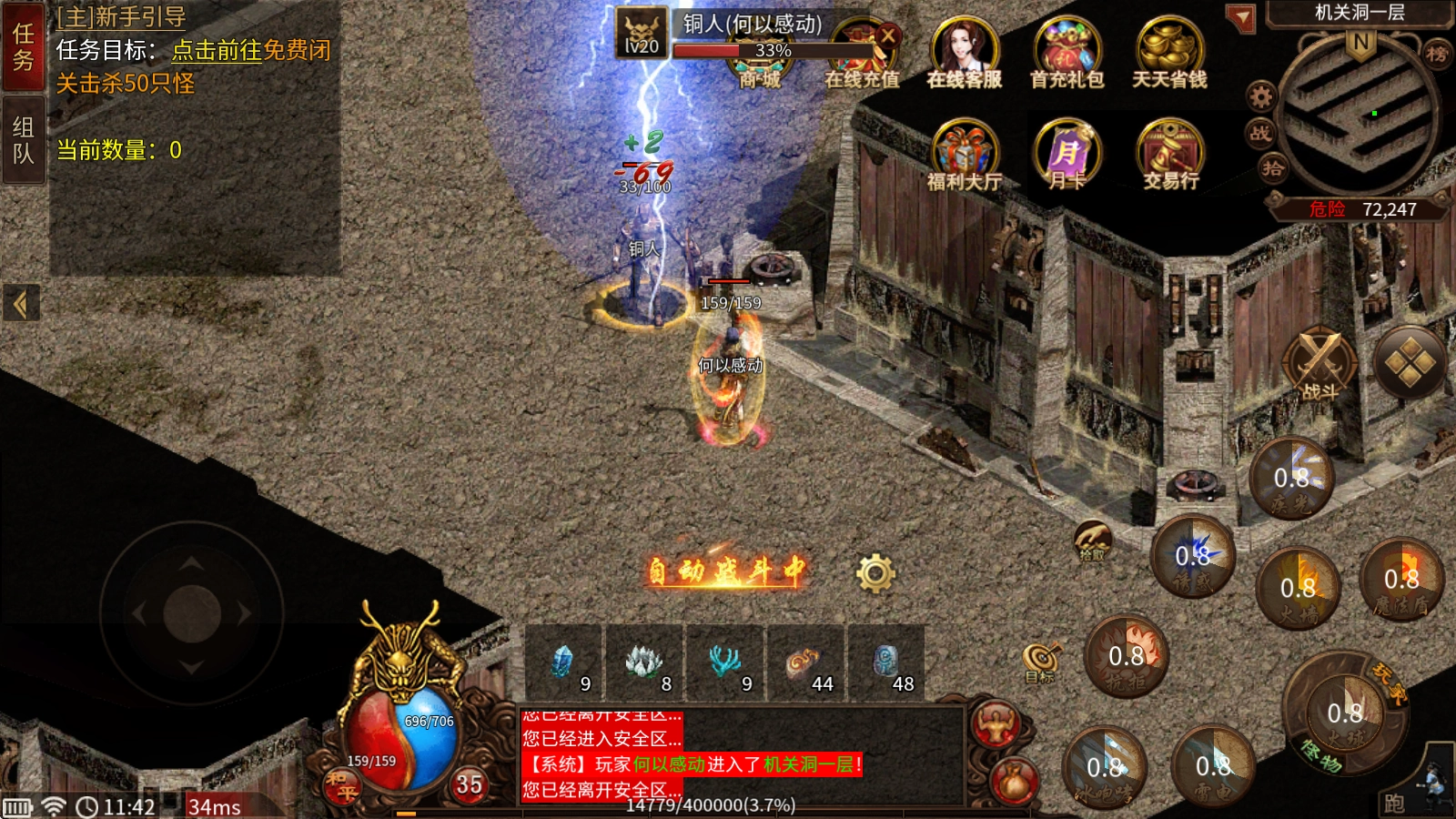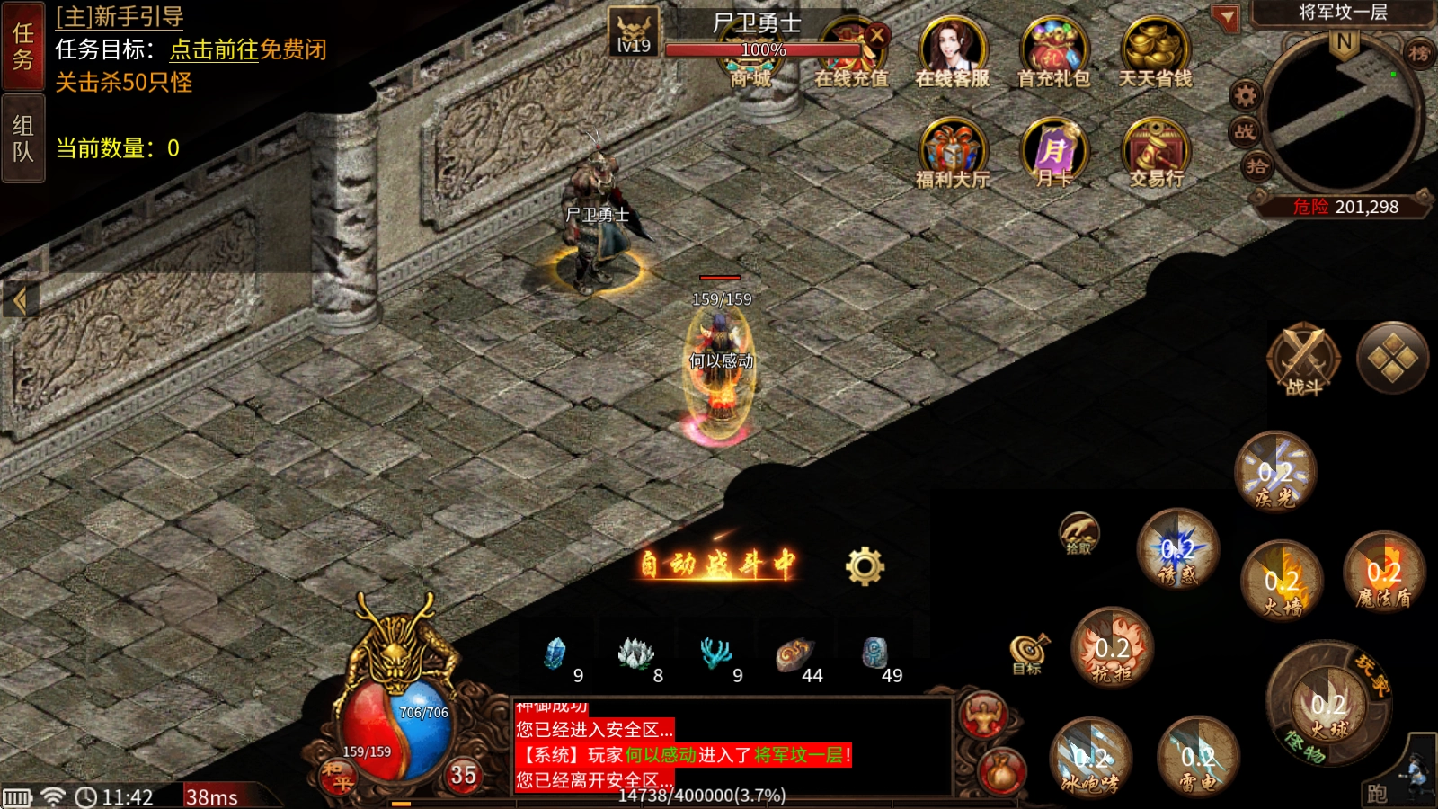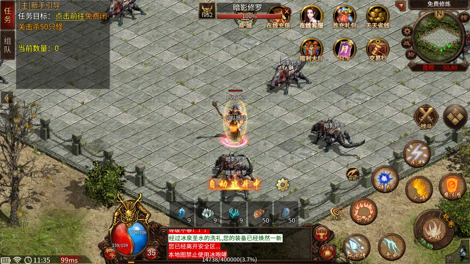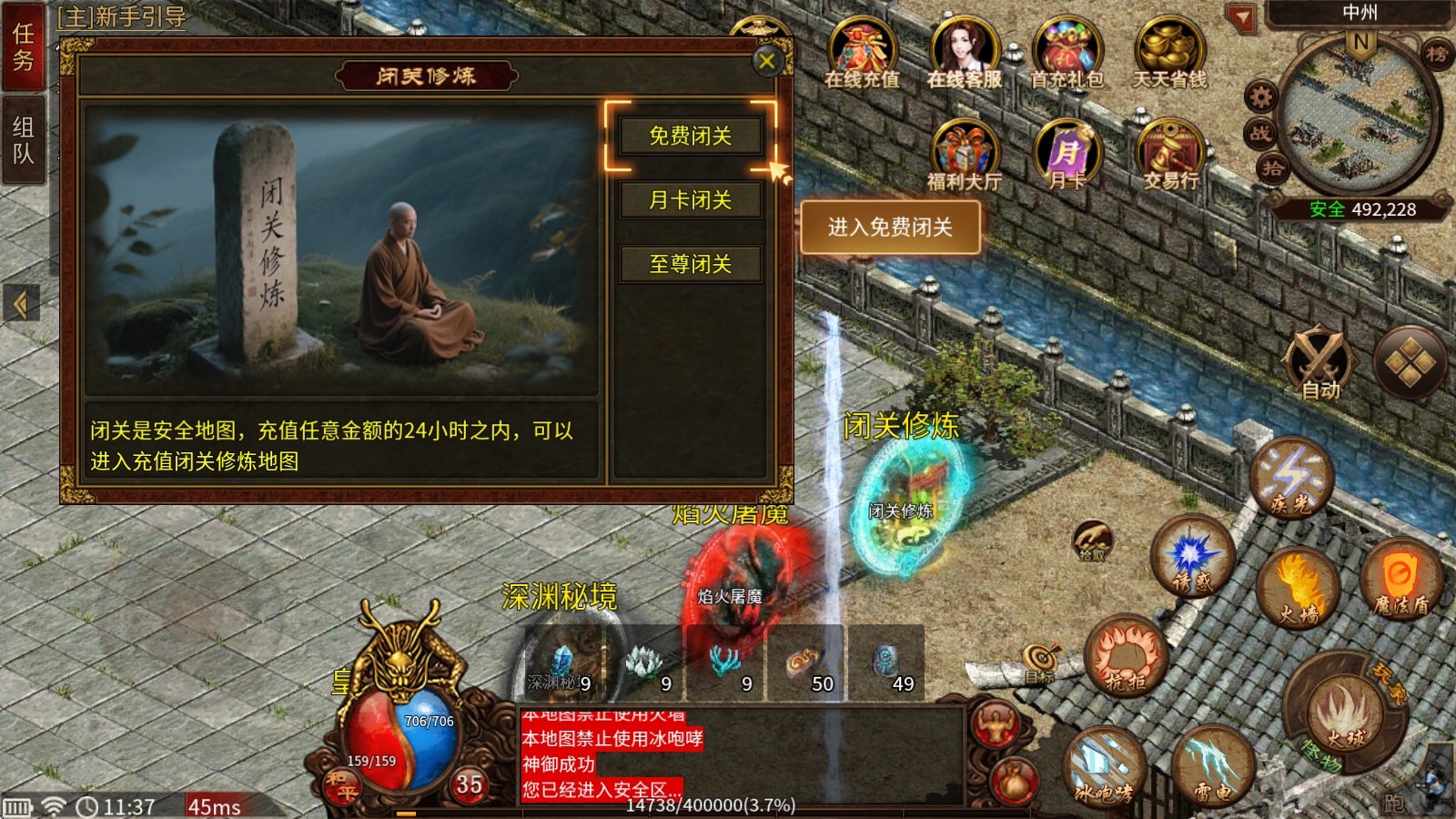 闭关修炼:闭关地图为安全区域,在充值任意金额后的24小时内,玩家可进入该充值专属的闭关修炼地图;此外,新手玩家还能享受免费的闭关时长福利。