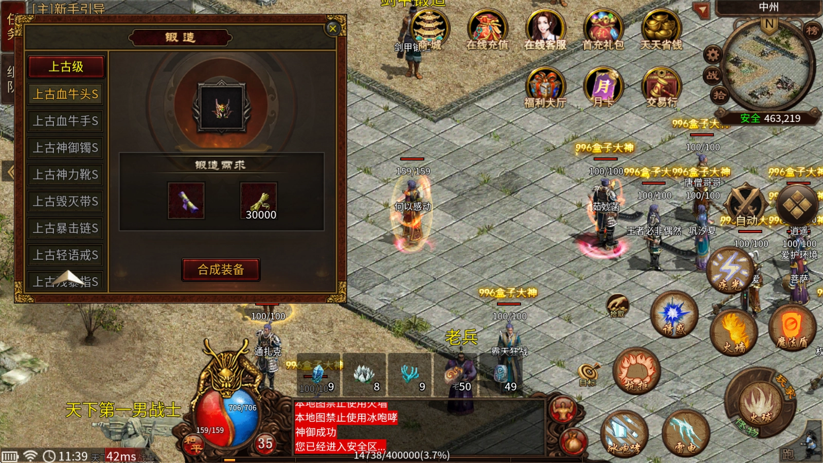 上古铸造系统:消耗传奇世界道具与修炼值,即可打造出上古级别的装备。其中,传奇世界道具可通过击败禁地魔王及更高级别的怪物获取。