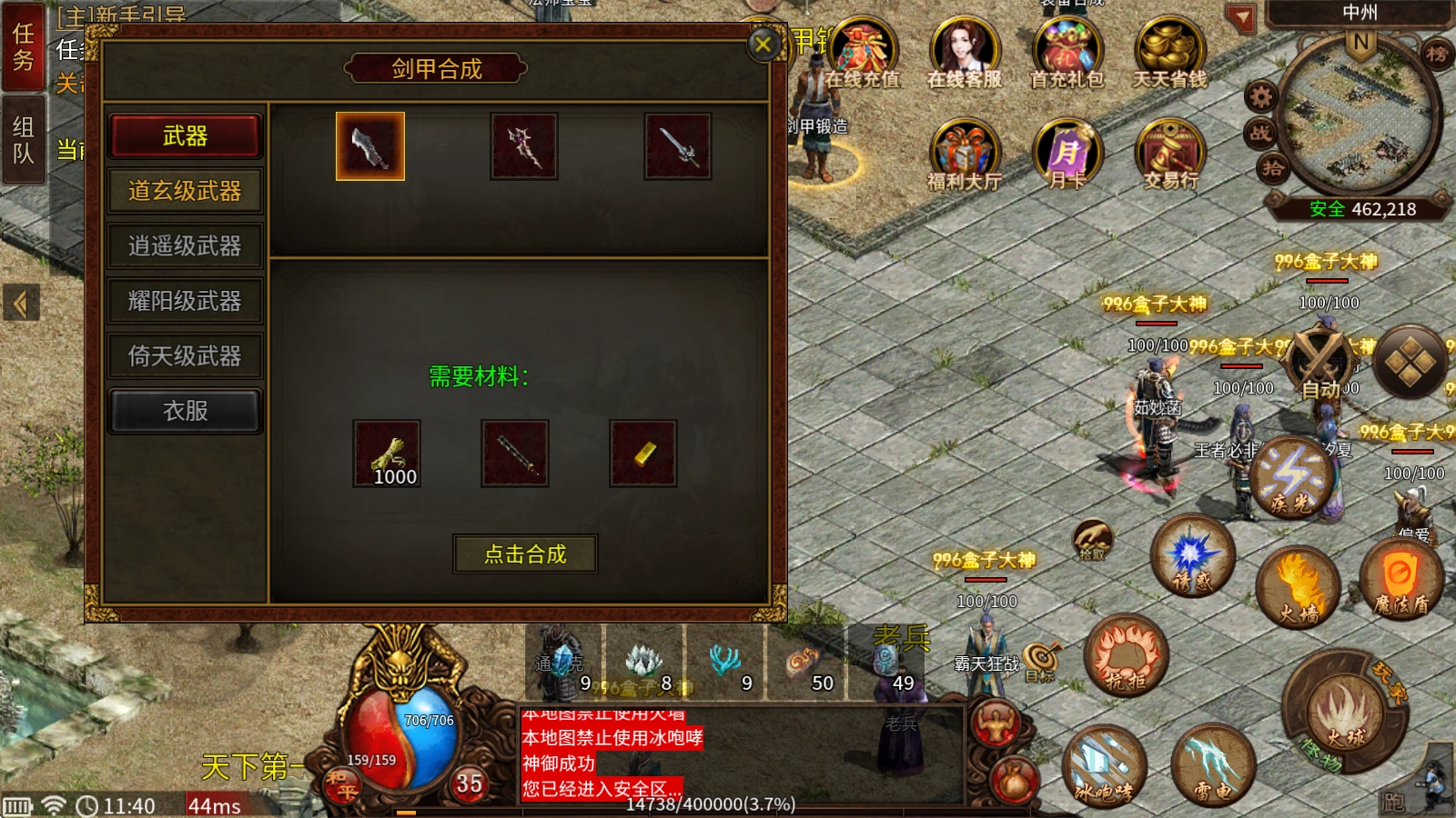 消耗金币与修炼值就能合成各类剑甲装备,既让修炼值成为游戏里不可或缺的“刚需”资源,也让散人玩家有机会获取终极神兵。