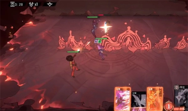 战斗过程中,游戏会随机刷新英雄的技能卡牌,玩家消耗随时间积累的一定点数就能释放这些技能。除此之外,英雄还拥有一个独立计算冷却时间的大招。简单来说,玩家在战斗时只有两件事可做:使用技能卡牌和释放大招。