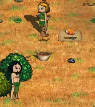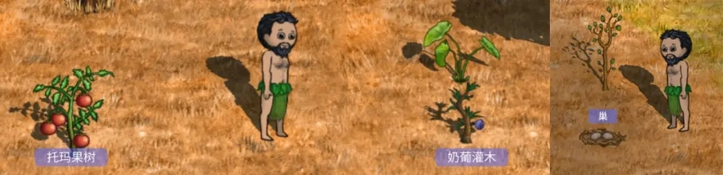 所以,刚加入部落的村民,能随时去采集结有果实的奶葡灌木与托马果树,以及鸟巢里的食物,直接食用,以此来应对还没开始建造家园前的饥饿问题,补充体力。