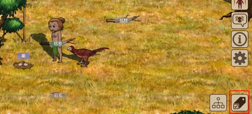 村民们开启右下角的标签功能后,部落里的动植物名称便会显现出来。这些名称的背景分为灰色和紫色两种类型:灰色背景的是普通道具,能够直接点击拾取并拿在手中;紫色背景的道具在点击后,会在限定时间内生成新物品,此时再次点击带有“吃”字的小框,就能将其取来食用。像结有果实的果树、藏有鸟蛋的鸟巢都属于紫色背景的可交互对象,完成交互操作后,就能获得可供食用的果实与鸟蛋。
