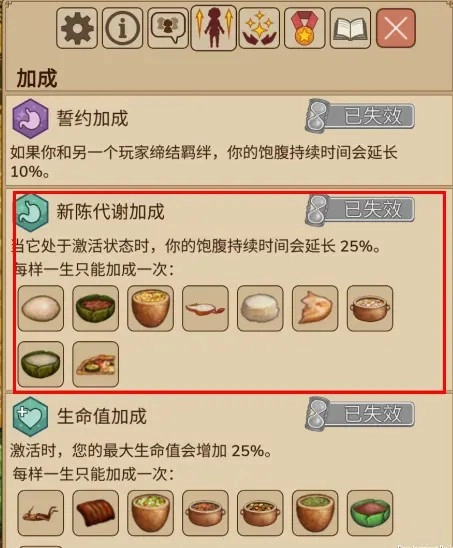 同时,在个人加成系统里,通过食用指定食物能激活【新陈代谢】增益效果,饱腹状态的持续时长会增加25%!这一点对每位刚加入部落的村民而言都至关重要~
