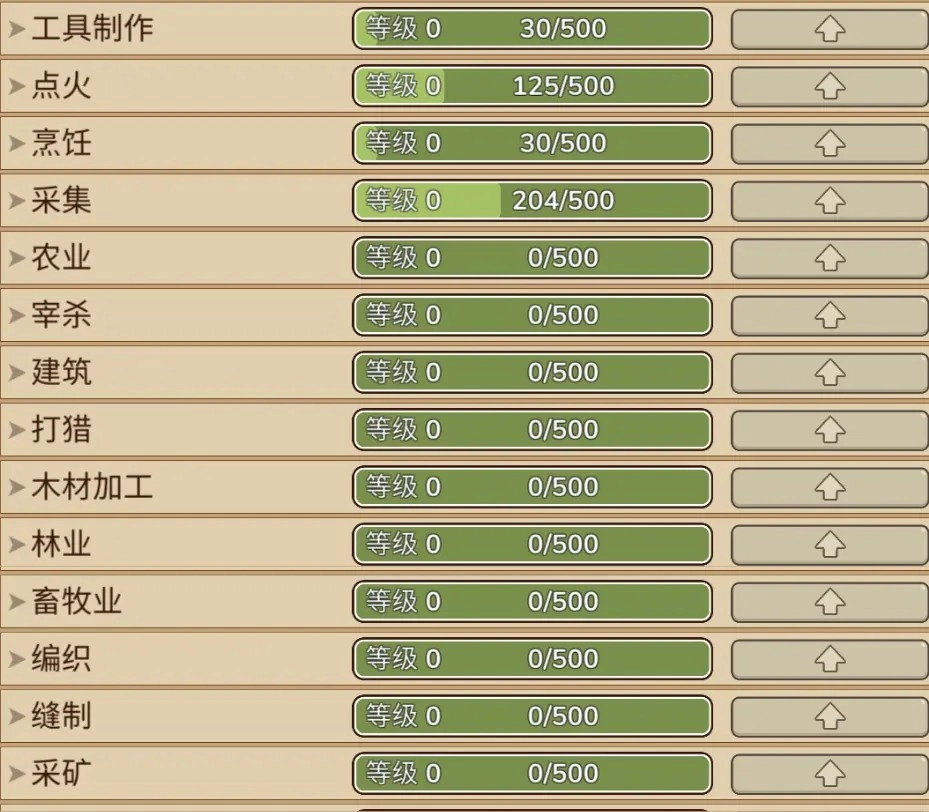 游戏里总共有17类可升级的技能,它们分别是:农业、工具制作、建筑、木材加工、林业、点火、烹饪、编织、采集、宰杀、打猎、畜牧业、缝制、采矿、铁匠、陶艺和青铜加工。