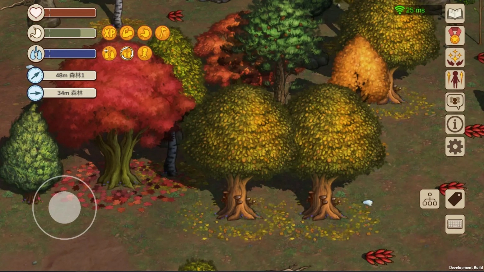 ⑥秋季森林:进入这片区域的入口处分布着三个独立的小型矿区,人们可以涉水到达。这里是许多村民选择建造家园的第二理想地点,不仅风光秀丽,还藏有神秘的遗迹。除了川鱼和湖鱼之外,这里没有其他生物,相比其他地貌要安全一些,但食物来源比较匮乏。它是采集云梅、平菇、栗子蘑菇、鸡油菌、牛肝菌等菌类,以及后期进行采矿、伐木作业的主要区域。