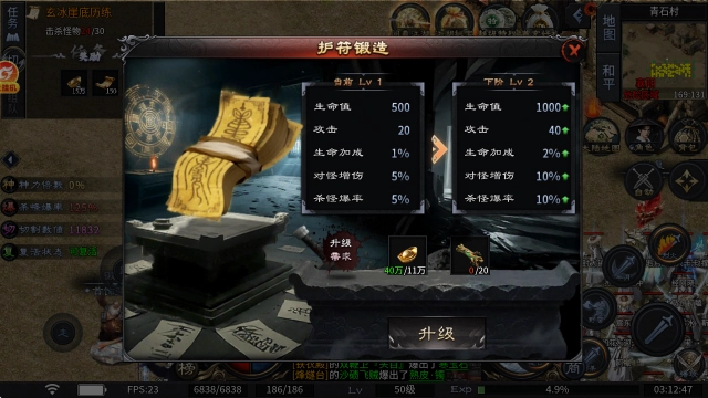 爆率护符:提升时需消耗元宝与灵檀木,每提升一级,对怪物的增伤效果和自身爆率都会增加,是打宝过程中必点的提升项。