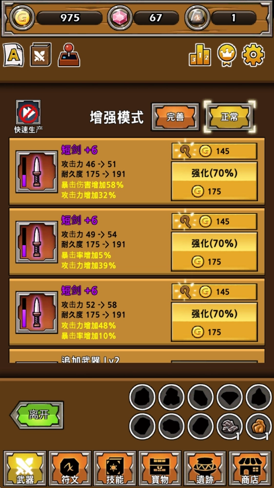 有了矿石之后就可以锻造名剑,还能用金币升级。