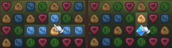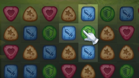 把4个符文连成一条直线,或者让5个符文组合成L型或T型进行消除,就能触发1次技能1,并且还会生成1个技能符文。当消除这个技能符文时,对应的英雄就会触发技能2。