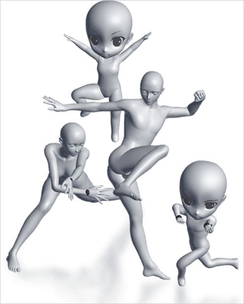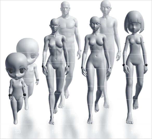 模型涵盖现实与动漫两种风格,头身比有1:3、1:5、1:6、1:7.5、1:8等不同比例,此外还配备了丰富的道具,像基本形状、家具、武器、配件、乐器之类的都包含在内。